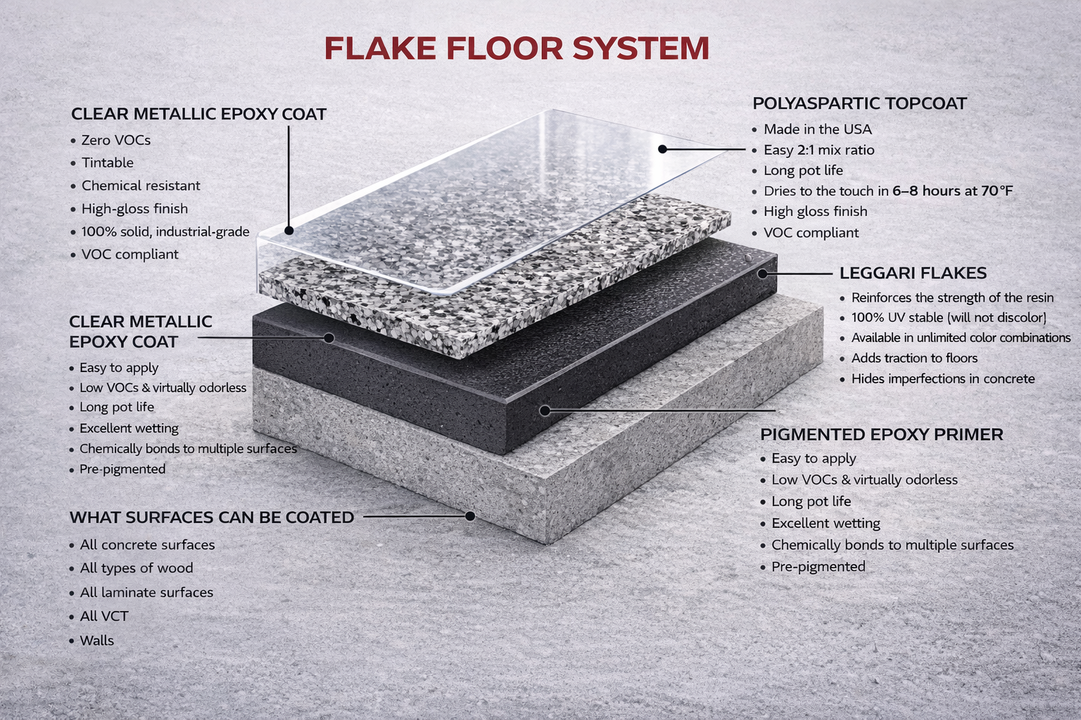Flake epoxy flooring is a multi-layer coating system that combines a pigmented epoxy base, decorative vinyl flakes, and a durable protective topcoat. The result is a seamless, slip-resistant surface that resists stains, moisture, chemicals, and wear while delivering a uniform, professional finish.